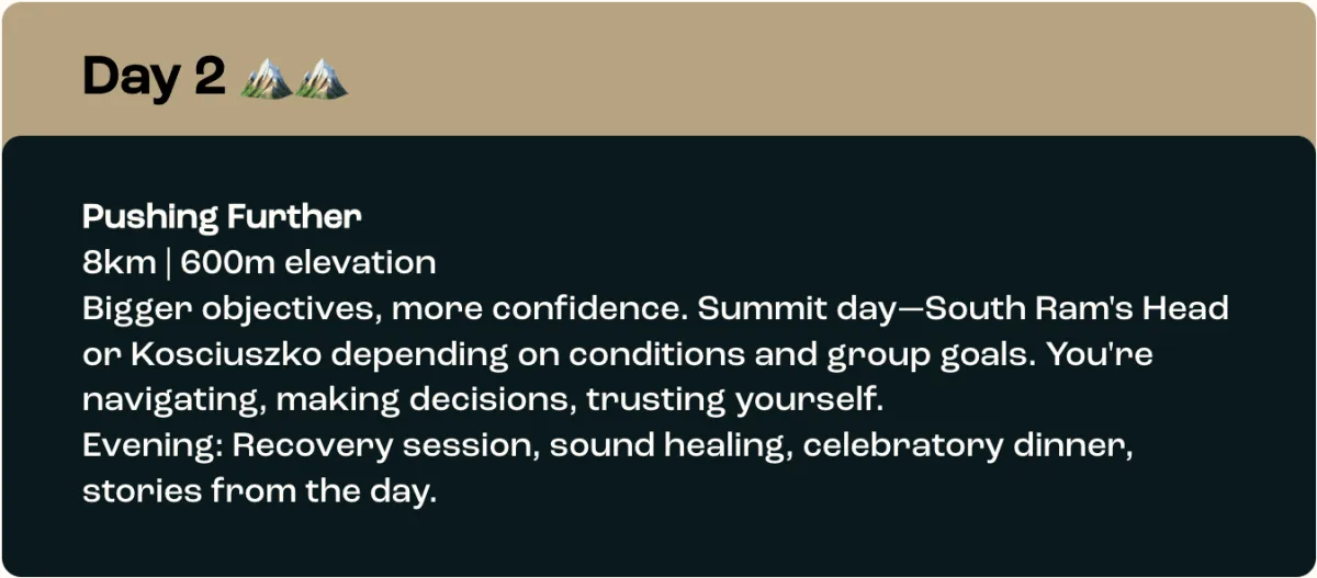 We've been guiding people into the Australian backcountry since 2003. From multi-day school expeditions to women's alpine retreats, we specialise in getting people safely outside—and helping them discover what they're capable of.