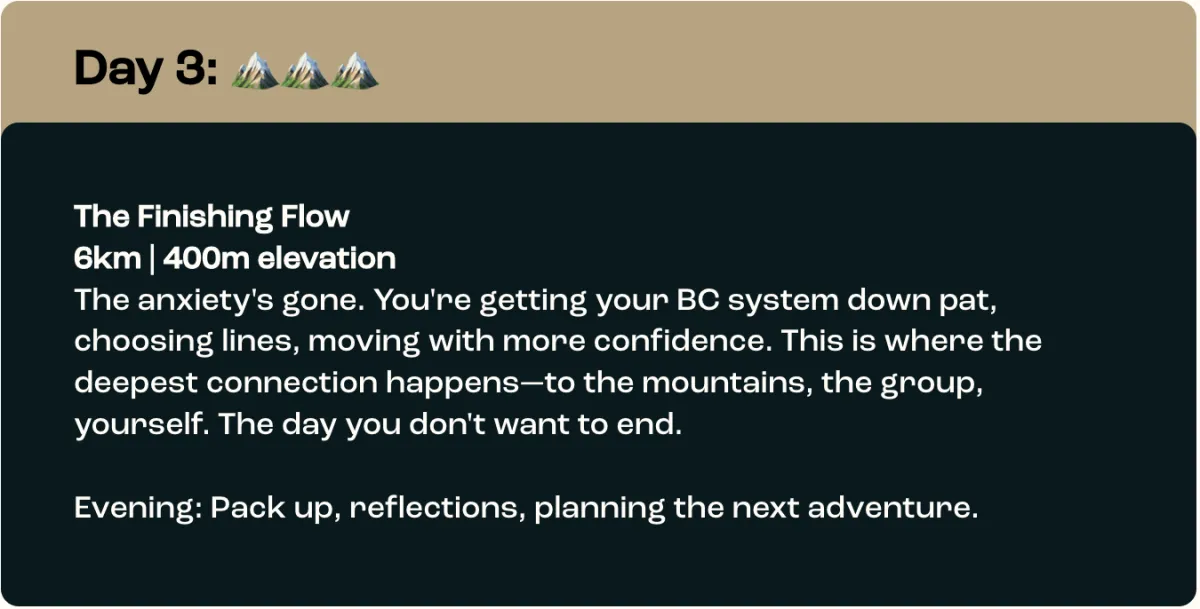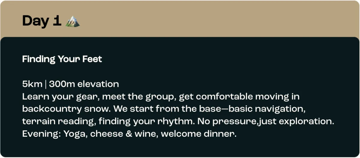 Learn your gear, meet the group, get comfortable moving in backcountry snow. We start from the base—basic navigation, terrain reading, finding your rhythm. No pressure,just exploration.